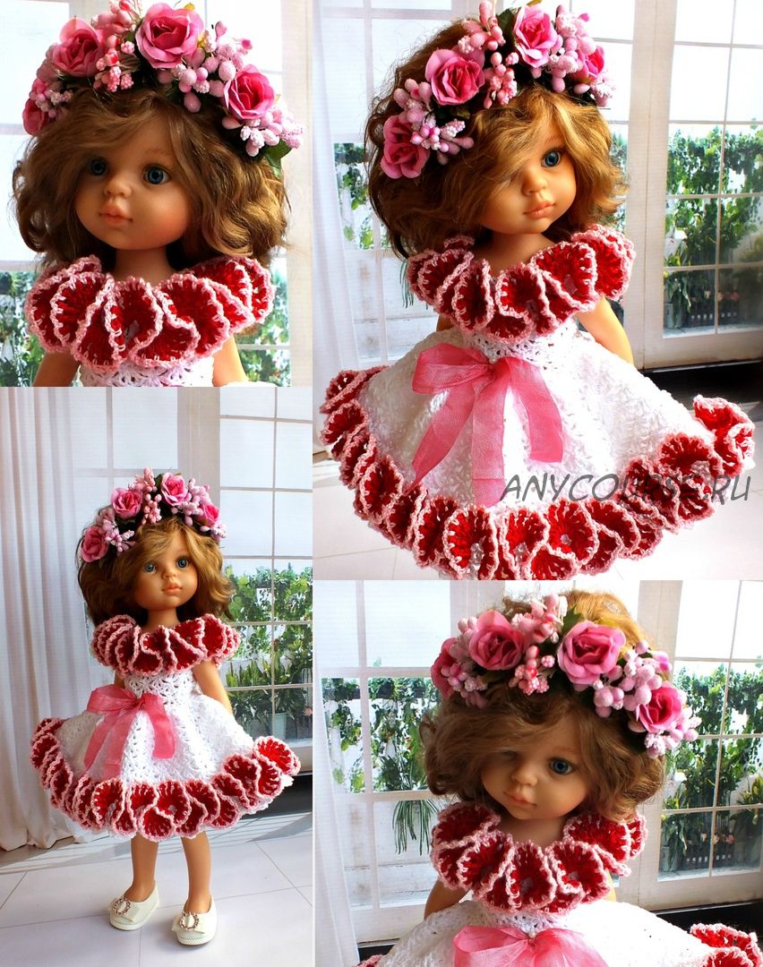 Свяжем вот такое прекрасное платье с круглой рюшей по горловине платья и по низу юбочки , а так же расскажу , как вязать V - образную рюшу, которую я показывала на розово - голубом платье .