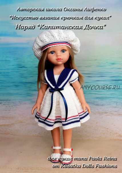 ? Вы свяжете красивое платье со складками и матросским воротничком, берет, сандалии и трусики для своей любимой куклы (или на заказ).