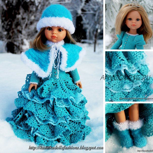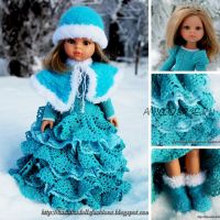 Вы свяжете красивое бальное платье, шапочку, пелеринку, сапожки и панталоны для своей любимой куклы (или на заказ).