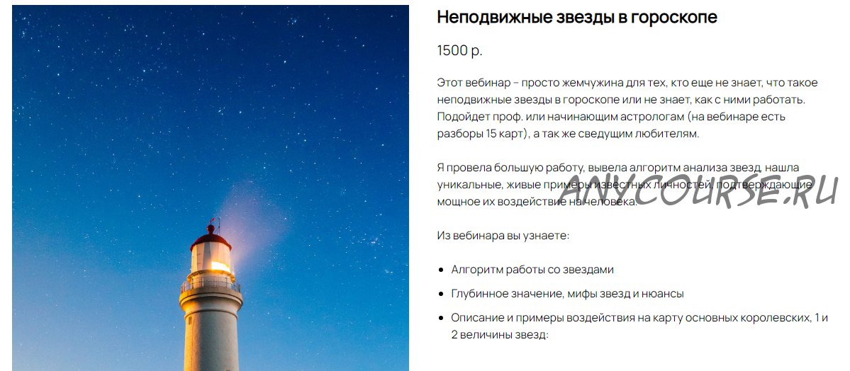 Этот вебинар – просто жемчужина для тех, кто еще не знает, что такое неподвижные звезды в гороскопе или не знает, как с ними работать. Подойдет проф. или начинающим астрологам (на вебинаре есть разборы 15 карт), а так же сведущим любителям.