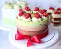 2. Бисквитный торт Фисташка-малина-лайм: 2 ВИДА фисташковых бисквитов, малиновый мармелад, мусс фисташка-матча, лаймовый крем-чиз, 2 ВИДА чистового оформления торта.