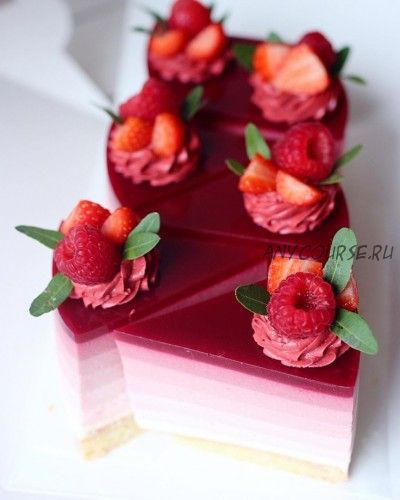 • Создание торта Розовый Градиент со всеми шагами и фото: основа, пропитка, сборка, 6 слоёв муссов по цветам, желе, 2 цвета крема с красителем и без, украшение кремом и ягодами, разрез, украшение лентой.