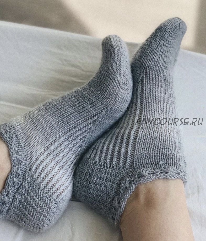 Носочки «Ракушки» вяжутся сверху вниз, начиная с манжеты основным узором, который продолжается вдоль центра верхней стороны стопы (низ стопы вяжется гладью). Паголенка в этой модели почти нет – сразу после манжеты начинается классическая стенка пятки с вытянутыми петлями. Клин подъема стопы оформлен резинкой со скрещенными петлями для хорошей посадки по ноге (чтобы носочек не «сползал» с ноги несмотря на отсутствие резинки в манжете) и прибавками вдоль центра низа стопы, повторяя анатомическую форму свода стопы. Мысок в этой модели классический, закрытие иглой.