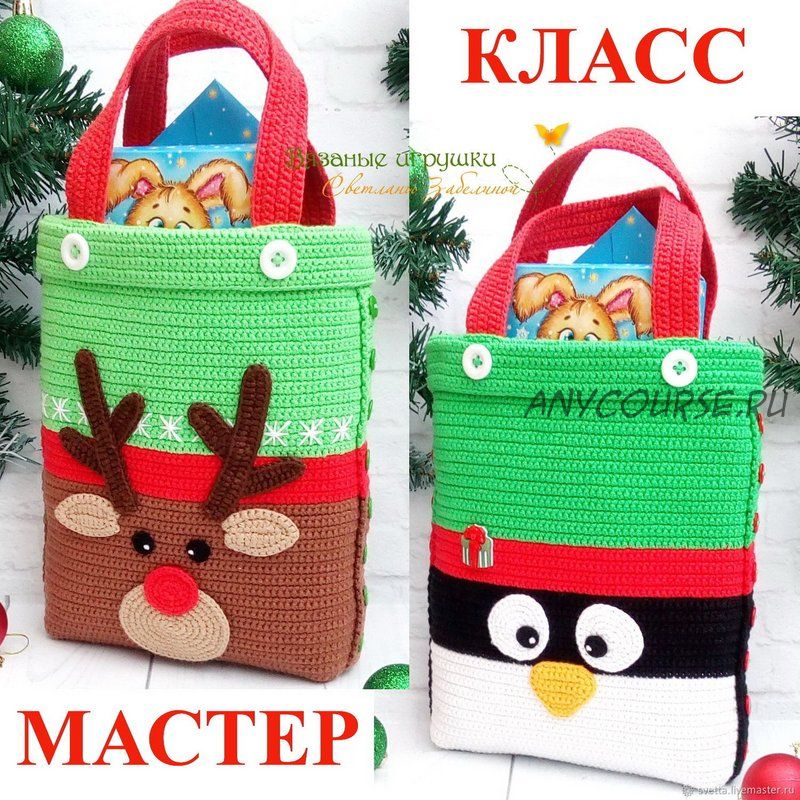 Предлагаю мастер-класс по вязаным крючком сумочкам для новогодних подарков с декором в виде мордочек Оленя и Пингвина.