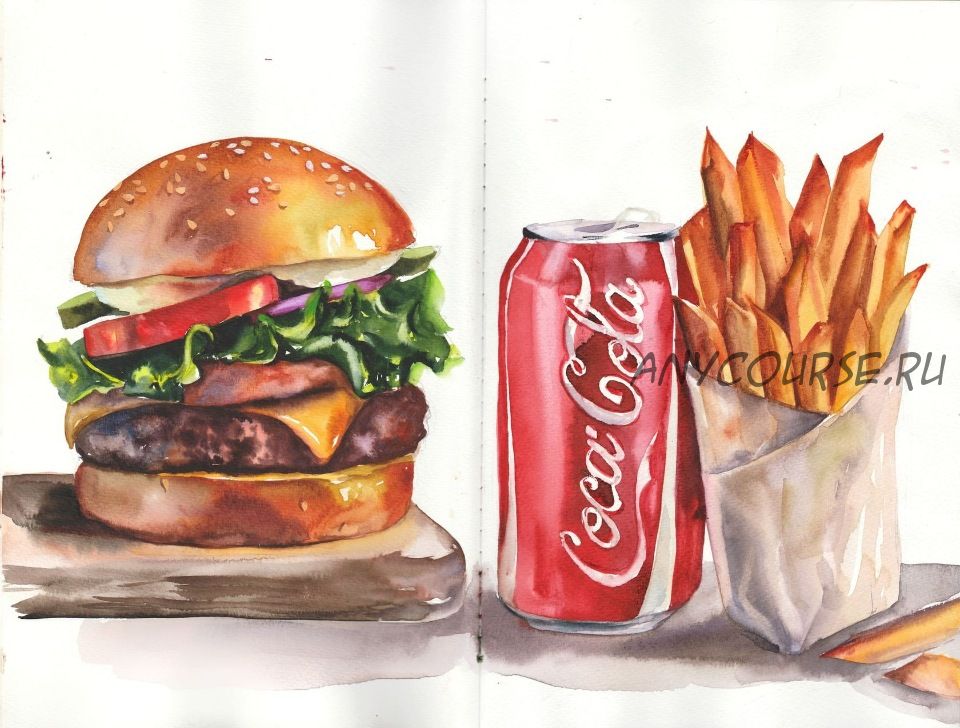 7 красочных блюд, 2 напитка, 5 разворотов в скетчбуке, 2 самостоятельных практикума и 2 бонусных урока.