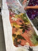 - Вы увидите подготовку и раскладку листьев, работу с красителями для шерсти и шелка, создание фона и самый горячий результат.