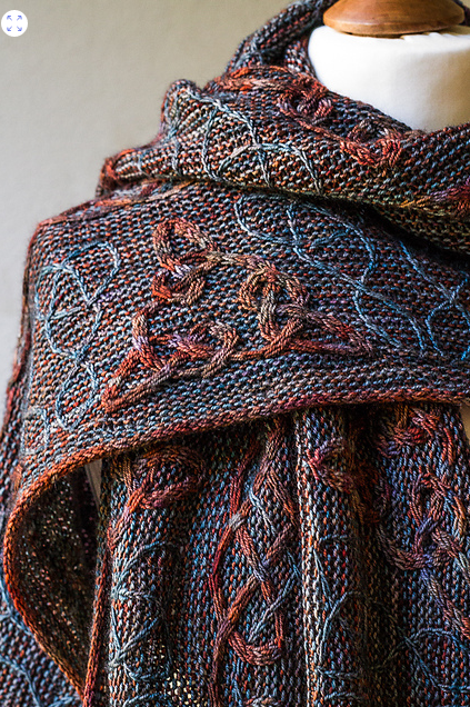? Этот большой прямоугольный платок использует новаторскую круговую разрезную конструкцию, которая формирует бахрому. Сложные косы были воодушевлены различными видами кельтского узла часто встречаемого в рукописях иллюминатов; в центральной оплетке более тонкие скрученные петли чередуются в контрастном цвете с основными косами. Вся цветная работа выполняется с помощью снятых петель жгутов, и поэтому не требуются протяжки или Интарсии. Треугольные узлы по краям являются ссылкой на рукопись Линдисфарна, которая дает этому платку свое название.