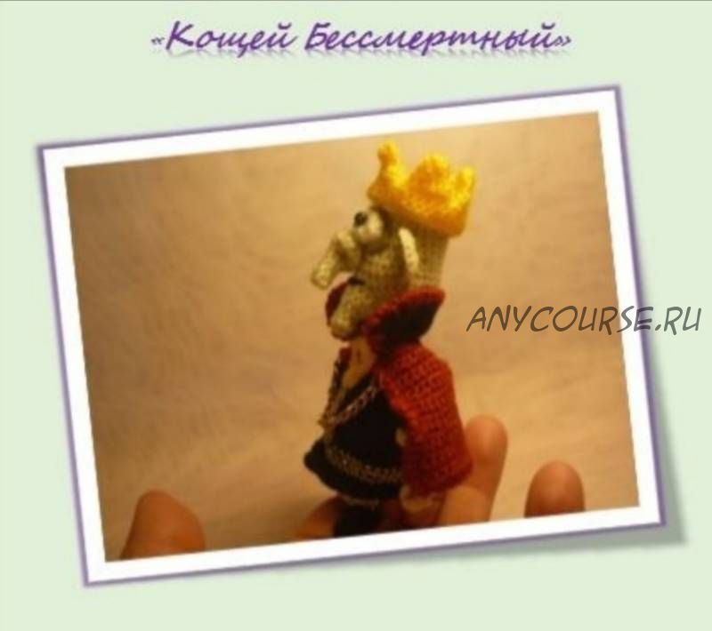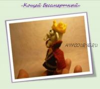 МК оформлен в формате PDF на 22 страницах с фотографиями процесса вязания. Кощей Бессмертный связан из полушерсти в три нити, это бобинная пряжа для вязальных машин. Размер кощея 9 см. Уровень сложности средний.