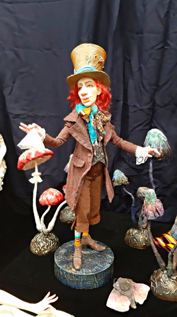 Мы будем работать с запекаемой глиной. Слепим ему голову, ручки, ножки. Тело куклы будет на каркасе. Мы сошьем ему невероятный, сложный, многослойный наряд, побудем с вами настоящими кутюрье. Мы с вами оформим личико Шляпника, прикрепим ему волосы.