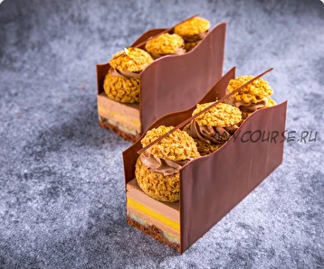 Состав: шоколадный бисквит; крокант; шоколадный крем; шоколадное желе; баварский мусс с фундуком; шоколадное песочное тесто; покрытие – велюр.