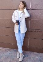 ? Женская рубашка большого объема, прямого силуэта из трикотажного полотна. Перед с отрезной кокеткой и клапаном, с центральной застежкой на петли-пуговицы. Спинка цельная. Рукав длинный одношовный с притачной манжетой без застежки. Линия плеча спущена. Воротник с отрезной стойкой.