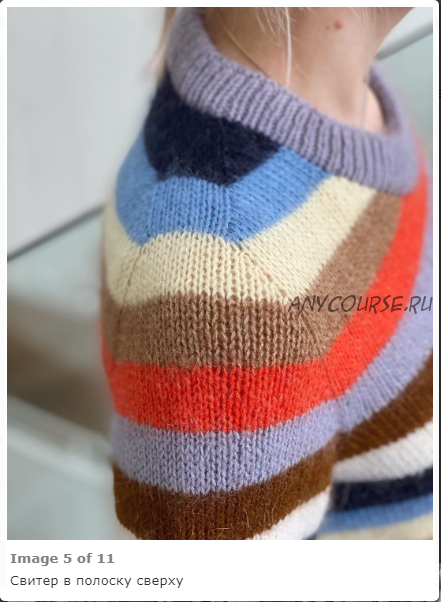 Свитер вяжется сверху вниз, комбинируя плечо-погон, втачной рукав, плавно переходящий в реглан. На фоне всей этой конструкции как раз очень эффектно смотрятся полоски.