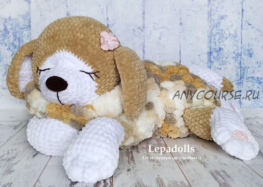 Пижамница из плюшевой пряжи, тело игрушки в виде мешочка, снизу затягивается кулиской с фиксатором.