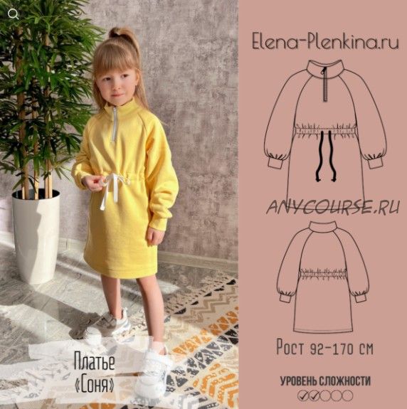 Детское трикотажное платье среднего объема, длинный широкий рукав покроя реглан с небольшим напуском и сборкой по низу рукава, низ рукава обработан двойной притачной манжетой, воротник стойка, на талии кулиска, спереди застежка на молнию, не доходящая несколько сантиметров до низа проймы, низ изделия в подгибку.