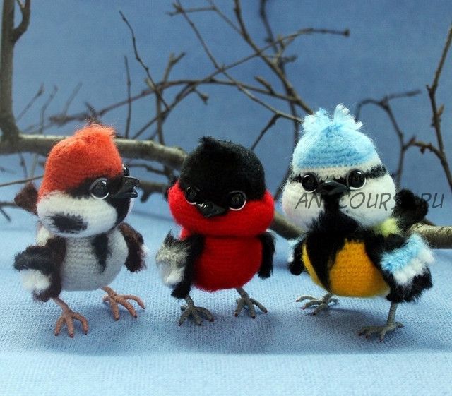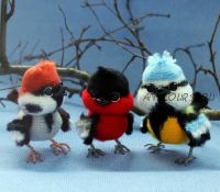 Росточком птички и впрямь невелички, всего около 9 см. Стоят сами, лапки у них проволочные. Летать не умеют, совсем малыши! Крылышки на нитяном креплении. Зато головой крутят во все стороны, она на подвижном креплении. Хвостик махонький, торчком. Клювики из пластики.