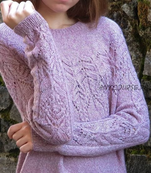 Momentum – это бесшовный пуловер, связанный сверху вниз, с круглой кокеткой. Сложно выглядящий, но легкий в исполнении ажур украшает кокетку и продолжается на рукавах, а остальное полотно выполнено лицевой гладью.