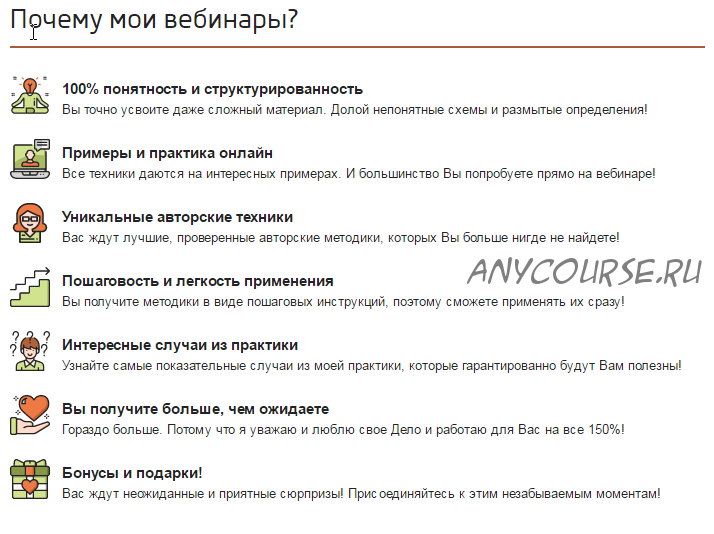 - Прослушаете и проанализируете более 10 живых примеров из практики психологов по работе с этой темой.