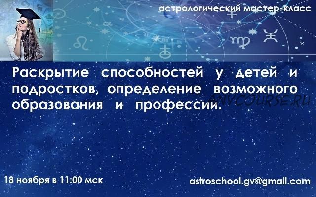 Приглашаем астрологов и изучающих астрологию посетить наш виртуальный мастер-класс, посвященный животрепещущей теме – раскрытию врожденных способностей и талантов у детей и подростков, а также выбору образования с учетом будущей профессии.