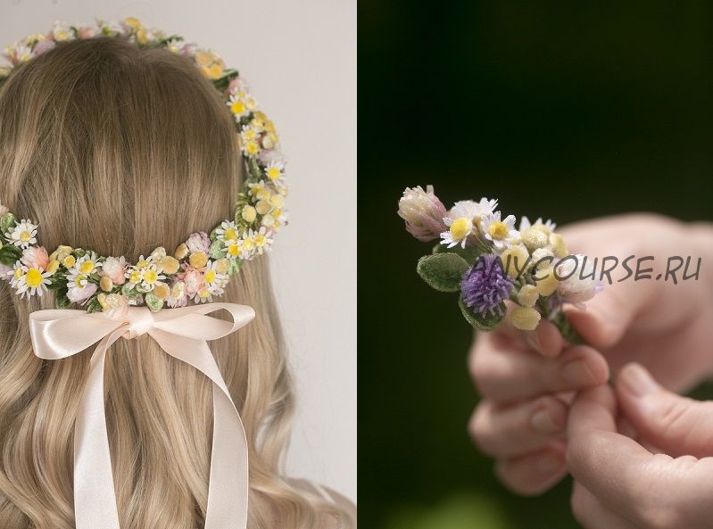 В венке и броши четыре вида цветочков - ромашка, пижма, клевер и короставник, а также два вида листочков.