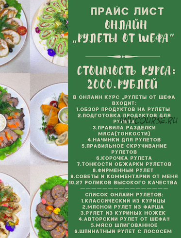 Список онлайн рулетов: 1. Классический из курицы 2. Мясной рулет из фарша 3. Рулет из куриных ножек 4. Авторский рулет от шефа? 5. Мясо шпиговонное 6. Шпинатный рулет с лососем