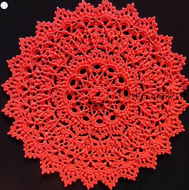 Your tension will determine things like hook size, yardage, finished size, and height of stitches. Any of these things can be adjusted as needed. Using recommended thread and hook this pattern will use minimum 370 yards of thread. And your finished doily will be about 14.5’’ / 37 cm in diameter.