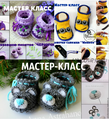 Сборник Мастер-классов по вязанию пинеток крючком включает в себя 3 мк : Пинетки 'Чернички' , пинетки 'Мишки Тедди' и пинетки - сапожки 'Миньон' Все мк доступные, подробные, с множеством фотографий.
