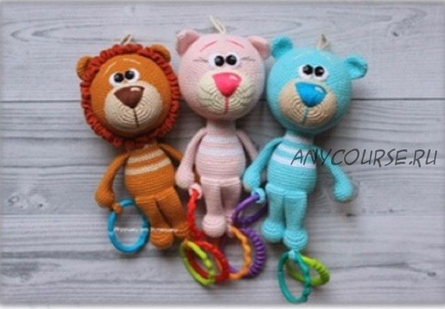 По данному мастер-классу вы сможете связать 3 игрушки: кошечку, львёнка и мишку. В мастер-классе описано как связать все три погремушки и все необходимые материалы для вязания. Формат pdf. Содержит 28 страниц и 83 красочных фотографий, 3 видео урока! Уровень средний, но все погремушки вяжутся очень легко и быстро.