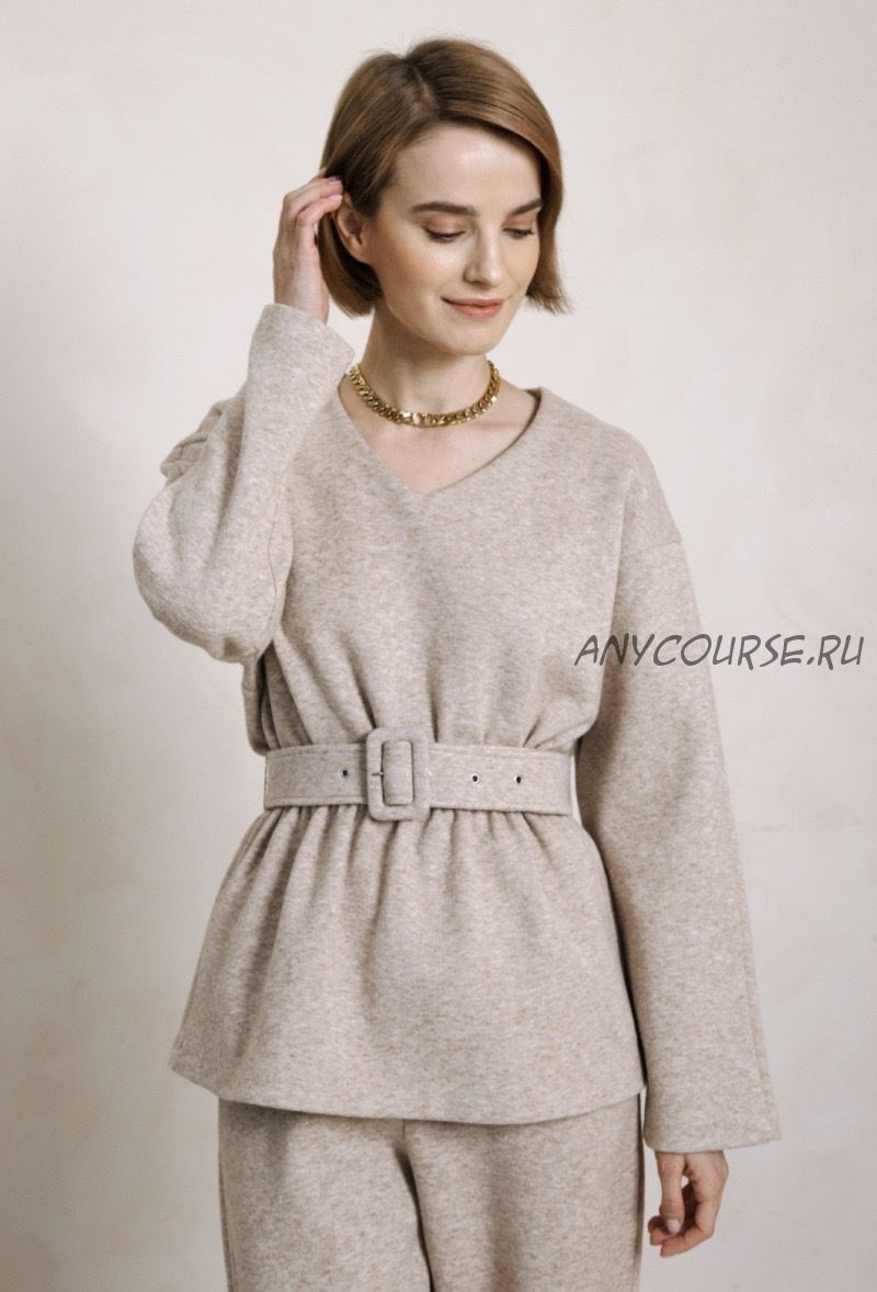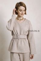 ? Блуза свободного силуэта со спущенной линией плеча. Горловина V-образная, обработана обтачкой. Рукав двухшовный, рубашечного покроя. Линия талии собрана на притачную резинку. Длина блузы до линии середины бедра. Пояс съёмный, с обтяжной пряжкой.