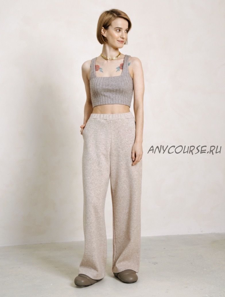 ? Трикотажные прямые брюки. Посадка брюк на талии. Брюки с притачным поясом, в пояс вставлена широкая резинка. Карманы с отрезным бочком.