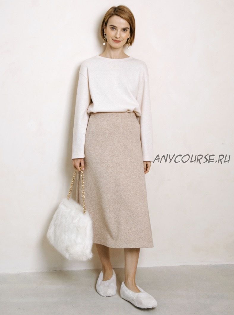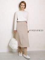 ? Юбка трапециевидного силуэта. Посадка юбки на талии, срез талии обработан притачной обтачкой, в обтачку вдета широкая резинка. Длина юбки ниже середины икры.