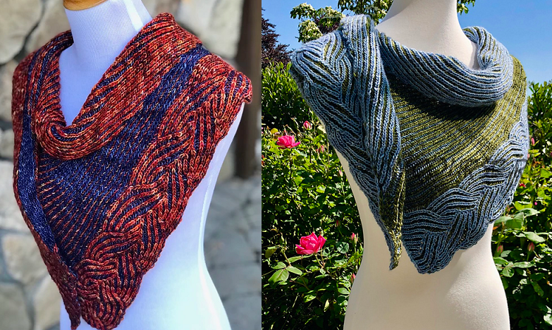 Шаль вяжется из конца в конец двухцветным узором бриошь, размер шали легко регулируется. В описании содержатся порядовые инструкции и схемы.