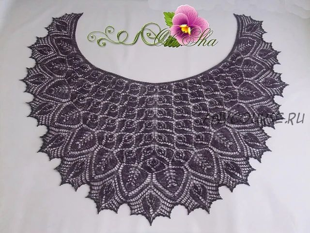 Шаль полукруглой, слегка серповидной формы, вяжется от середины основания к кайме.