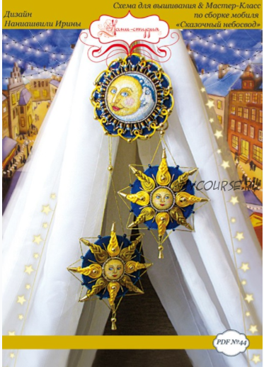 'Сказочный небосвод' включает 3 схемы: 2 звезды, Солнце и Месяц. Все схемы представлены в цветном и ч/б варианте. Описан процесс сборки каждой детали, а так же сборки всего мобиля. И, конечно, как же без фотографий каждого процесса!