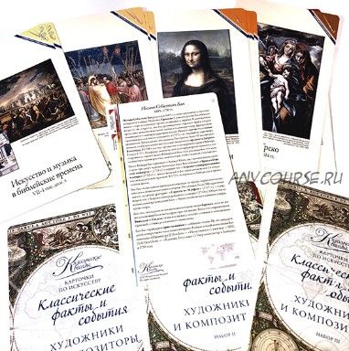 В набор включены не только 12 художников и композиторов, которые мы изучаем в Цикле 2 (руководство 'Основы' программы 'Классические беседы'), но и информацию о зарубежном искусстве XVII-XX веков (Рубенс, Веласкес, Рембрандт, Вермеер, Гейнсборо, Гайдн, Бетховен, Коул, Брамс, Дега, Моне, Ренуар, Гоген, ван Гог, Дебюсси, Пикассо, Дали), а также об искусстве исламского мира, Индии и Китая.