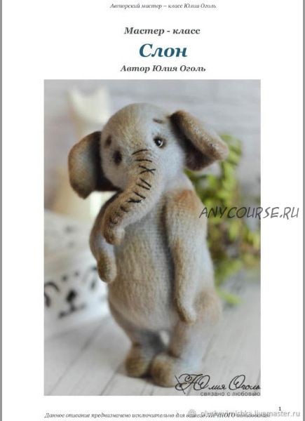Мастер- класс составлен на 38 стр печатного текста + множество пошаговых и подробных фото Весь материал для вязания слона предоставлен на второи страничке Слон связан крючком. Полностью подвижен. Ручки, ножки, голова - шплинтовое крепление. Ножки и хобот- проволочныи каркас Уровень сложности вязания среднии.
