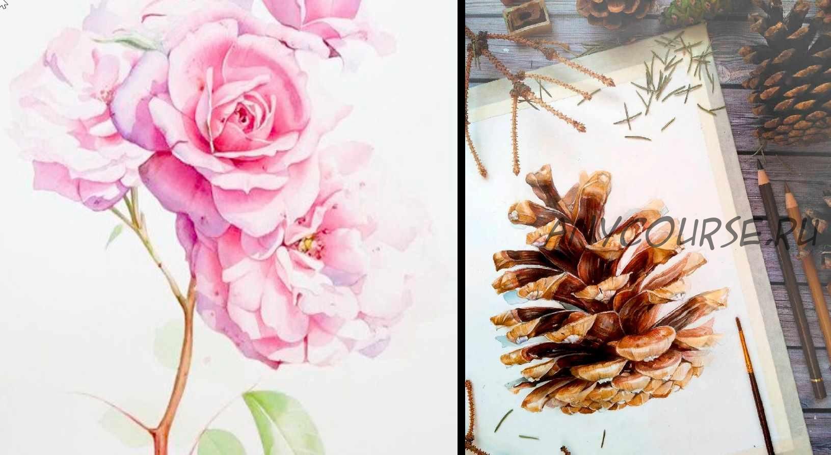 Используя акварель в сочетании с графитом и цветными карандашами, мы подробно ознакомимся с принципами отображения сложной фактуры на телах вращения. Оттачивать свои навыки мы будем на примере двух объектов – шишки и розы. За 22 урока вы научитесь создавать удивительно реалистичные изображения, применяя смешанную технику живописи. Благодаря интенсиву вы освоите одну из самых сложных тем в обучении акварели – изображение воды. Авторская техника художника позволит реалистично изображать блики и водную гладь, использовать маскировочную жидкость и стилизовать образы человека.