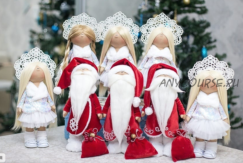 Подробные видеоуроки по созданию куколок от подбора материалов до оформления образа в целом (раскроим и сошьем тело куколок, мы разберем несколько вариантов ножек, с использованием ткани и меха, сошьем наряды, сделаем прическу Снегурочки из шерсти для валяния и трессов, сделаем бороду Деду Морозу. Украсим аксессуарами, санками, подарками.