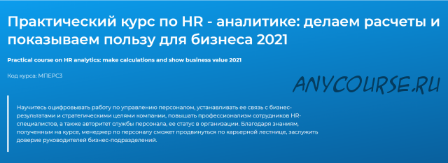 Курс выработает у слушателей понимание, как подходить к HR-аналитике, как в принципе ее проводить, а также вооружит реальными примерами, формулами расчетов для того или иного конкретного случая.