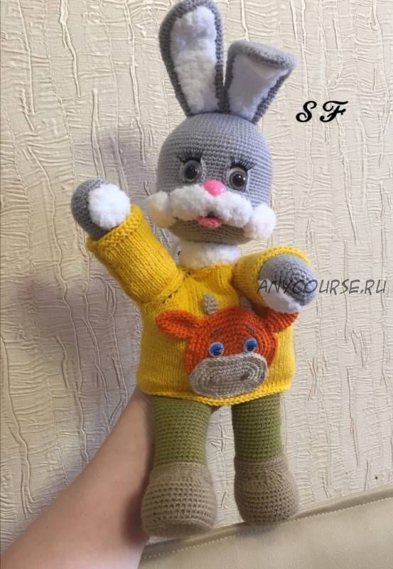 Мастер класс в PDF формате на 22 стр. содержит 51 фотографий и подробное описание процесса вязания крючком Степашки, а так же вязание спицами свитер. Рост без ушек 30 см. с ушками 37 см.