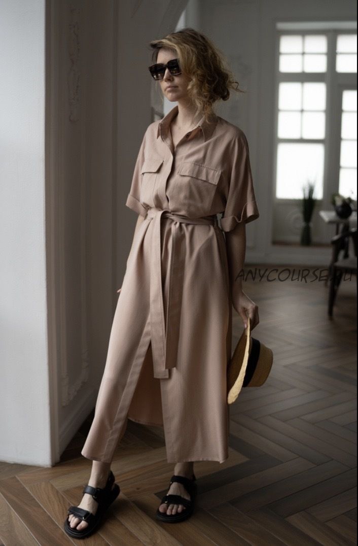 Выкройка платья большого объема, прямого силуэта. Застежка полочки и клапанов кармана супатная, с обметанными петлями и пуговицами. Горловина оформлена отложным рубашечным воротником-стойкой. На деталях полочки оформлены накладные карманы с клапанами. Рукав цельнокроеный, короткий с притачной манжетой. Пояс съемный, фиксируется шлевками по боковым швам. В боковых швах выполнены карманы, а также обработаны разрезы. Низ изделия фигурный. В платье используется обработка без оверлока - французский шов.