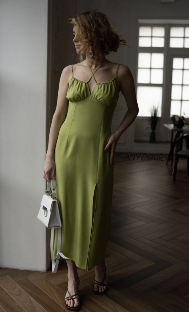 Выкройка сарафана малого объема, прилегающего силуэта. Верхняя часть с отрезным верхом на подкладке. По верхнему краю лифа кулиска, в которую продеты длинные бретели, которые формируют сборку. Бретель скрещивается по центру и завязывается на шее. Нижняя деталь переда и спинка с талиевыми вытачками. В рельефе по левой стороне переда обработан разрез. Застежка на потайную молнию. Верхний срез спинки обработан обтачкой.