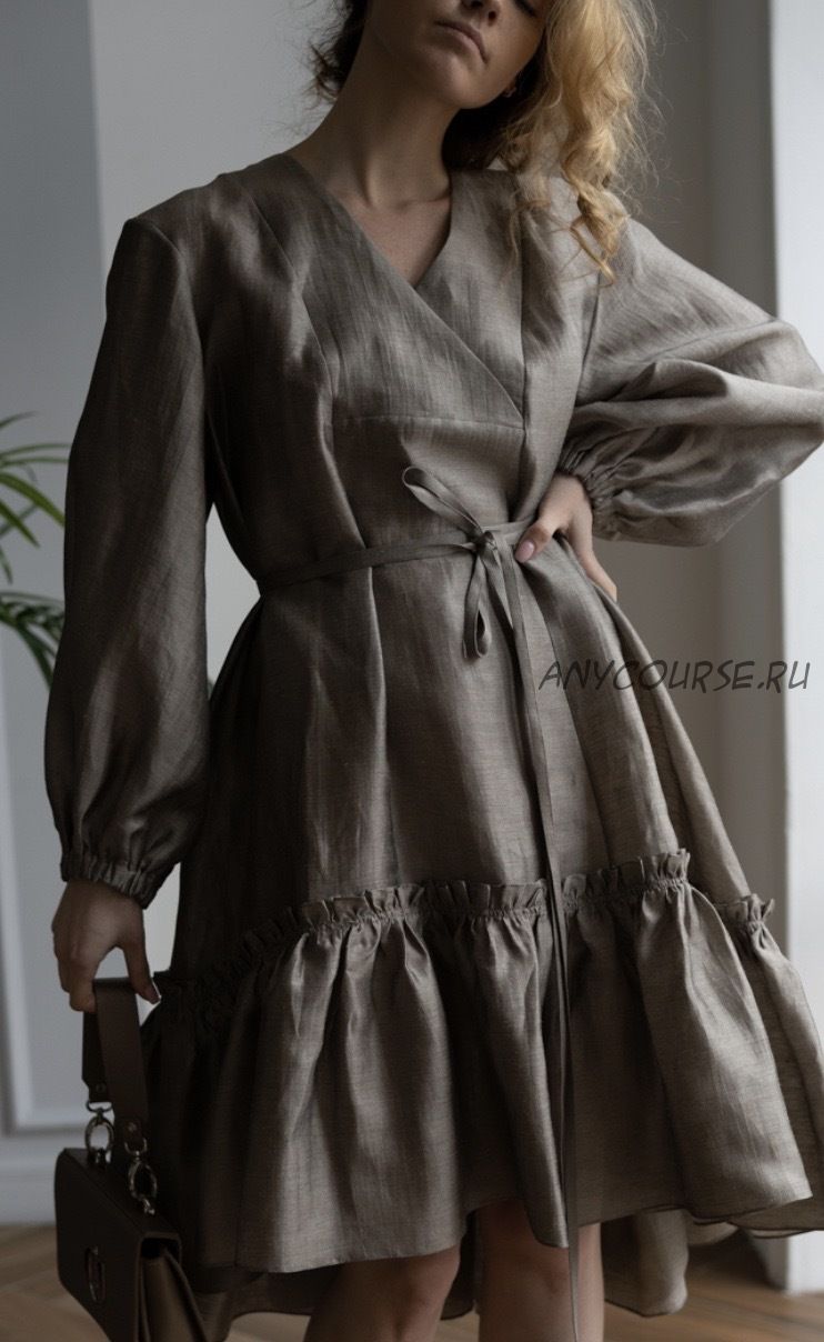 Вырез горловины V-образный. В верхней части переда оформлена деталь с запахом на подкладке. По переду фигурные швы. Горловина спинки обработана обтачкой. Нижняя часть платья с асимметричная - перед короче чем спинка. По низу притачная рюша на сборке. Рукав одношовный, объемный, втачной, к низу расширен и обработан манжетой на резинке.