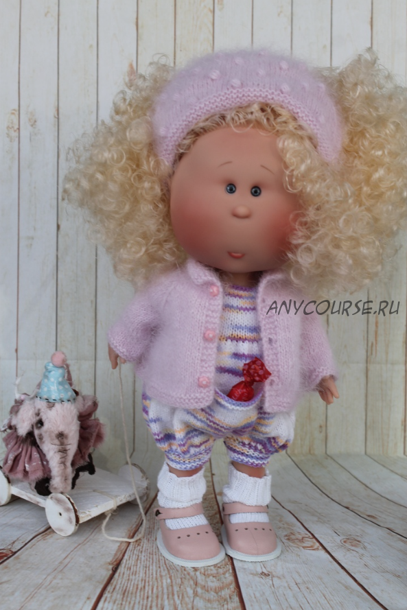 ? Вы свяжете комплект-песочник с большим карманом, кофточку с узором 'шишечки', распашная с застежкой на пуговках, косынку на любой тип волос куклы, гольфики.