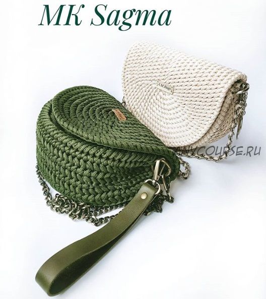 Показано, как вязать узор по спирали и поворотными рядами, все расчеты на два типа шнура, соединение частей сумки, финальная обвязка.