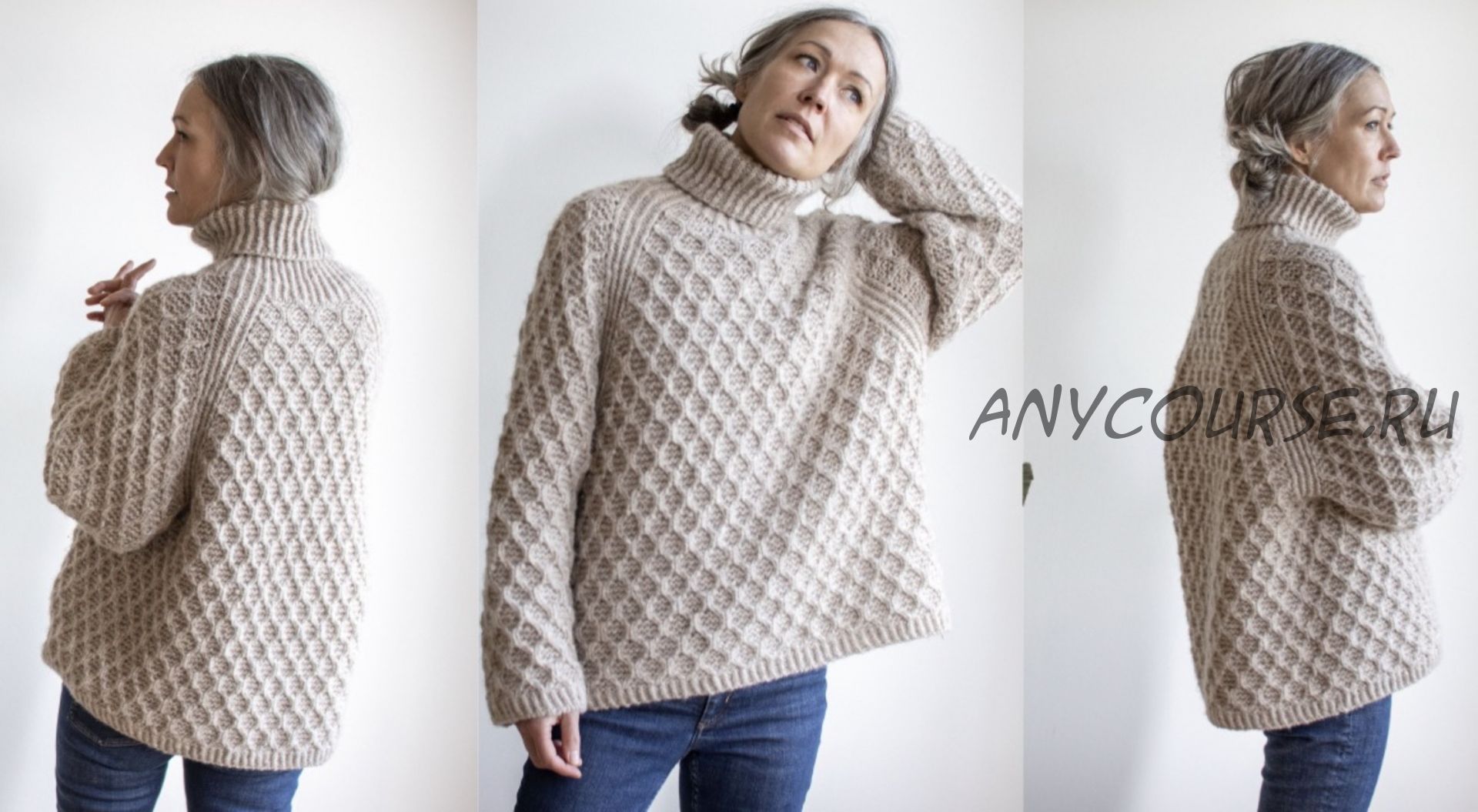 Большой и вместительный свитер с графическим узором косами, элегантным вырезом реглан и скрещенными резинками.