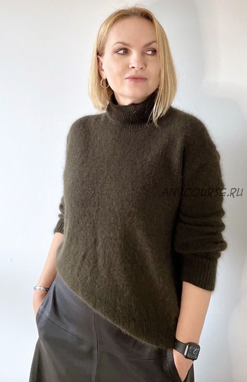 Свитер вяжется снизу вверх по частям и сшивается. Формирование проймы и плечевых скосов представляет собой комбинацию прямой проймы со стороны полочки и плавный скос со стороны спинки; передняя пройма длиннее, переходит на спинку и пришивается к линии плечевого скоса спинки.