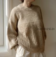 It features a round-neck, drop-shoulder, ballon sleeves and an oversized bozy cut. It is worked from the top down. The back is knit first. Then, the front shoulders are picked up from the shoulder edge and worked top down as you shape the neck. Finally, the front and back are joined together at the underarm and the body is knit seamlessly in the round to the hem.