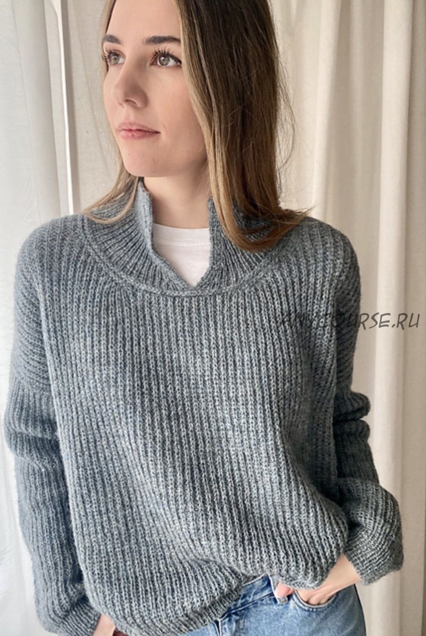 Интересный свитер с уникальным воротником вяжется спицами сверху вниз полурыбацкой резинкой.