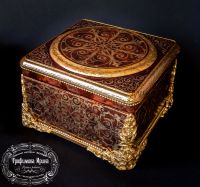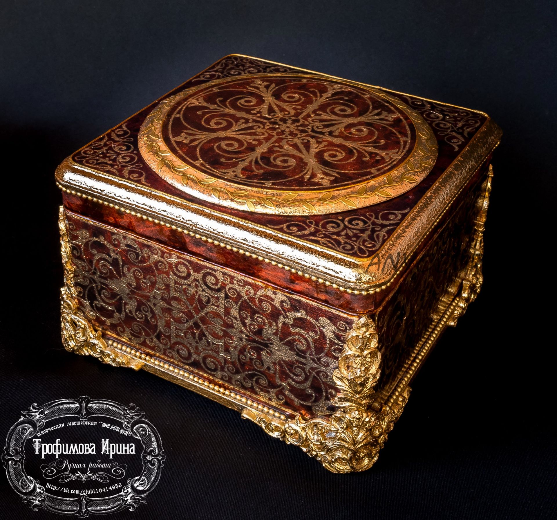 табакерка в стиле Буль(имитация капа ореха) Фото мастер-класс по имитационной технике в стиле Буль , описание процесса имитации капа ореха спиртовыми морилками, изготовление гибких отливок из молдов и работа с зеркальной поталью.
