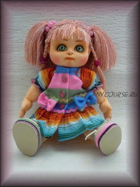 В Мастер классе подробно описывается каждый этап формирования куколки. Выкройки не сложные. Для покупателей этого Мастер класса прилагается выкройка одежды (платье, трусики) и выкройка ботиночек. Изготавливается кукла без вставок и каркаса. Полностью мягкая, хорошо держит форму. Выкройку куклы, при желании, можно увеличить или уменьшить. Волосы могут сделаны любым, доступным вам, способом, а можно купить в моём магазине уже готовые. Для моники достаточно иметь 3 метра бахромы для волос. Если усвоить последовательность изготовления и технологию, то достаточно 2 - х дней для изготовления.?